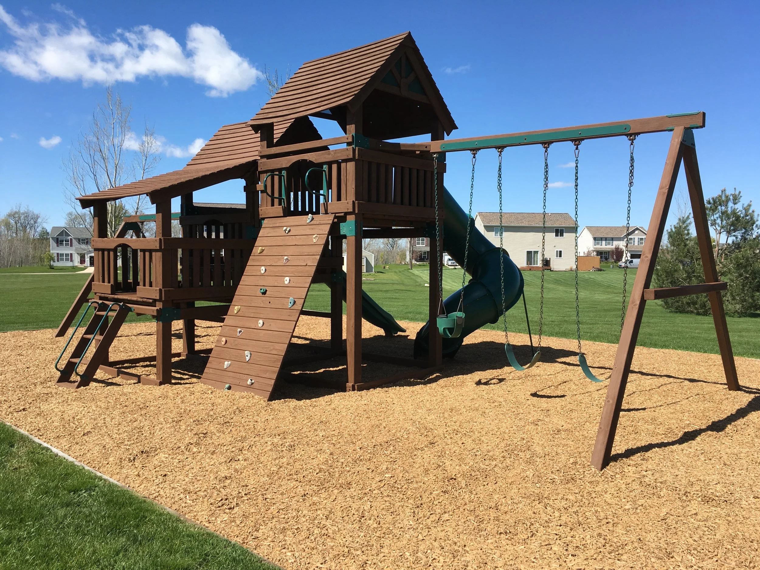 A community playground with four swing sets, oversized swing, two slides, climbing wall, and picnic table.